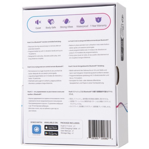 - Hush изготовлена из безопасных для здоровья материалов, не содержит латекса, резины или фталатов, обеспечивая вам безопасное и комфортное использование.