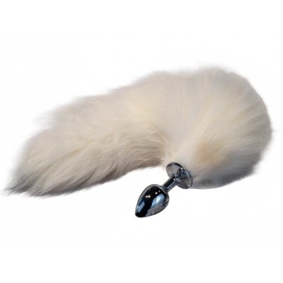 Металлическая анальная пробка M с белым лисьим хвостиком из натурального меха 44 см