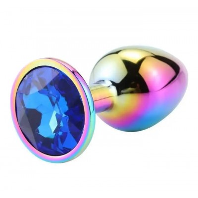 Разноцветная анальная пробка с синим камушком L
