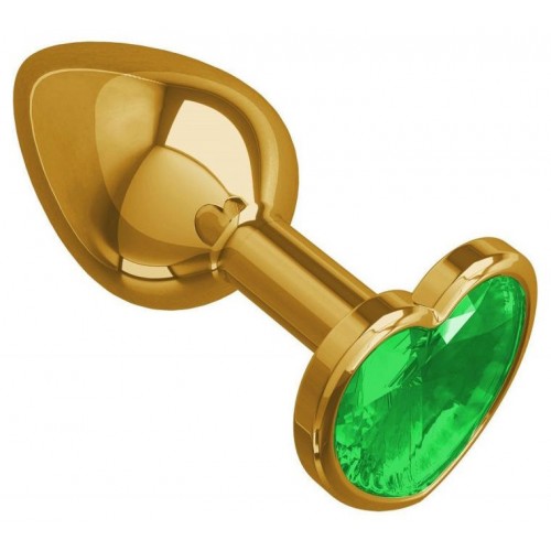 Золотистая анальная пробка с зеленым камушком в виде сердечка S