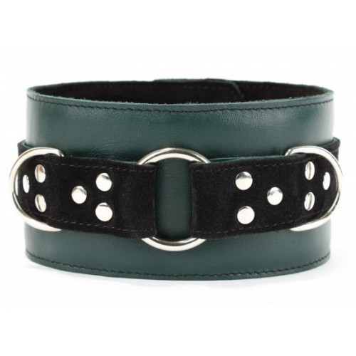 Ошейник выполнен из натуральной кожи изумрудного цвета, декорирован вставкой из черной замши, заклепками, металлическим кольцом и двумя полукольцами.
