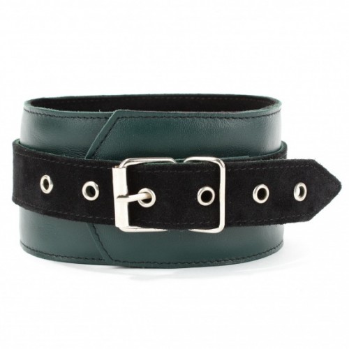 Поводок с одной стороны выполнен из натуральной кожи изумрудного цвета, с другой стороны - из черной замши.