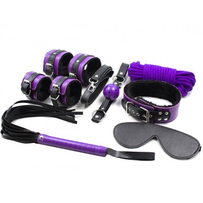В набор входят: наручники, поножи, плеть, веревка, кляп, ошейник с поводком и маска для глаз.