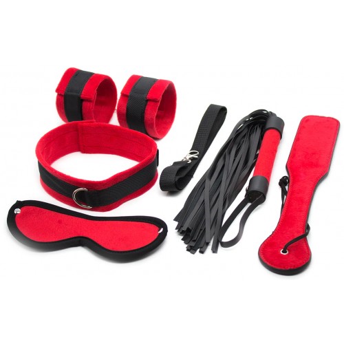 В набор входят: наручники, плеть, маска для глаз, пэдл и ошейник с поводком.