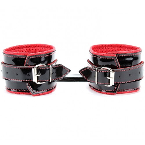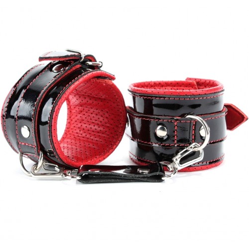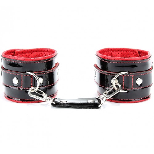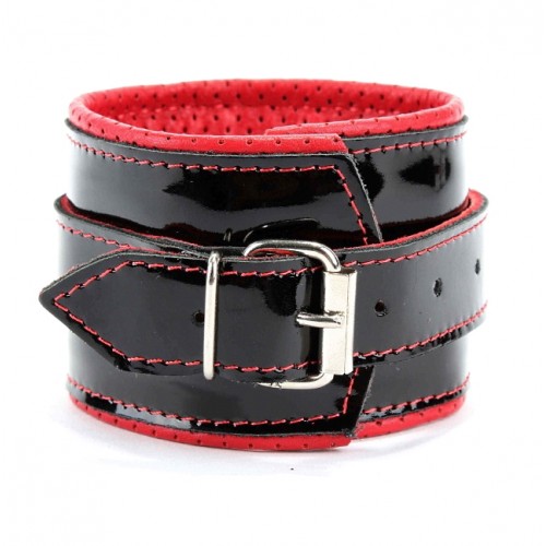 Шикарные наручники на пряжке, выполненные из натуральной лакированной кожи черного цвета с красным подкладом с перфорацией, выполненным из перчаточной кожи.