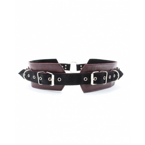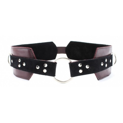 Пояс выполнен из натуральной кожи бордового цвета, декорирован ремнями из черной замши, тремя металлическими кольцами и четырьмя полукольцами.