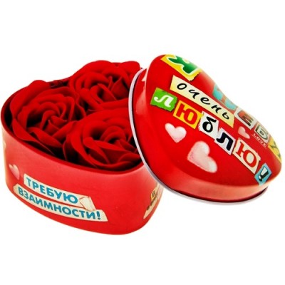 Три бутона мыльных алых лепестков преподносятся в аккуратной металлической коробке в форме сердечка с уникальным дизайном. Сувенир станет особенным подарком для вашей второй половинки или избранницы, которой вы планируете признаться в любви.