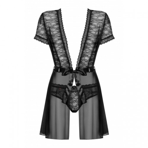 Этот невероятно сексуальный комплект из потрясающей коллекции эротического белья польского бренда Obsessive. Верхняя часть пеньюара выполнена из кружевной ткани, а юбка сделана из легкого и воздушного полупрозрачного материала. Короткие рукава и декольте отделаны кружевной лентой. Пеньюар завязывается при помощи атласного пояса. В комплект входят также кружевные трусики, декорированные маленькими бантиками, а также заманчивым вырезом сзади.