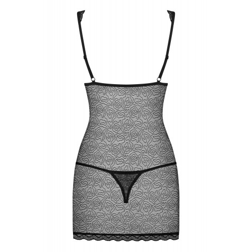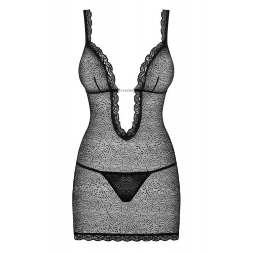 Сорочка выполнена из приятной черной прозрачной сетки с красивым декором.