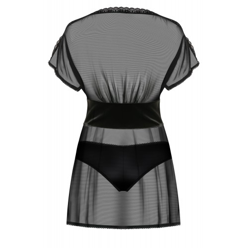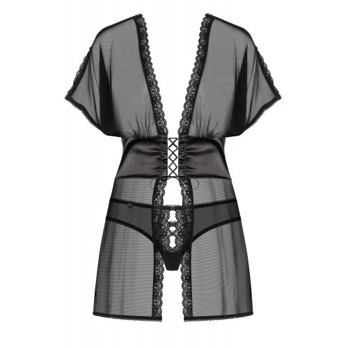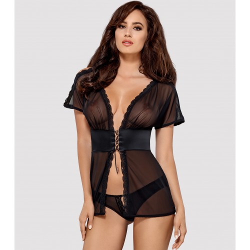Детали: уникальный воздушный беби-долл из прозрачной сетки, разрезы на рукавах кокетливо приоткрывают плечи, элегантное украшение в виде фианитов черного цвета - шесть тонких вставок на плечах, регулируемая шнуровка под грудью - сексуальный мотив, идеальная посадка, полоска из атласного материала красиво соединяет верх и низ сорочки, края бэби-долла декорированы кружевом, интригующие разрезы на бедрах, приятная на ощупь эластичная ткань.