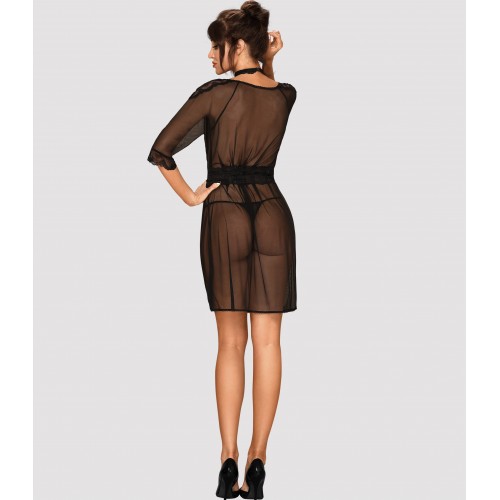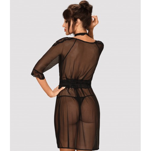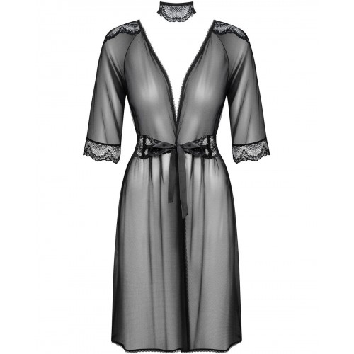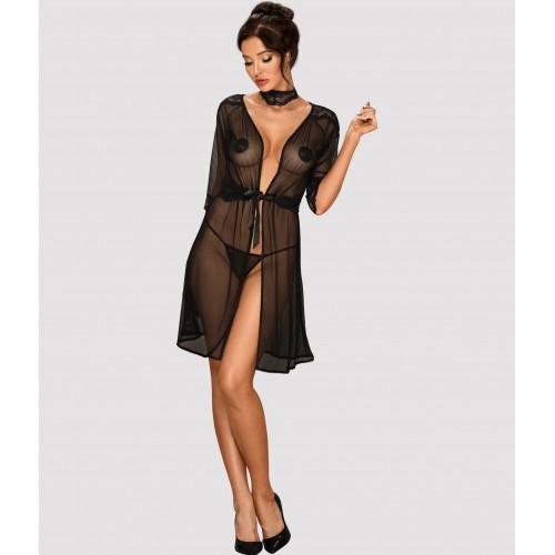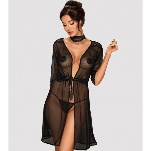 Комплект включает в себя пеньюар, чокер и кружевной пояс.