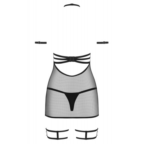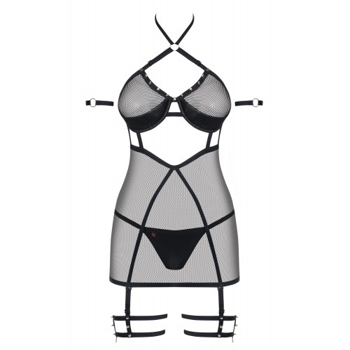 Детали: смелое сочетание прозрачной сетки и полосок на бедрах, имеется застежка на шее, чашечки с частично мягкой подкладкой на косточках, соблазнительно подчеркивающие грудь, регулируемые бретели на шее и многоступенчатая регулируемая застежка на спине, обеспечивающие идеальную посадку, своеобразный крой - полоски, соединяющие верхнюю и нижнюю части сорочки, сексуальные браслеты на руки, съемные подвязки с двойной полосой вокруг бедер - чрезвычайно чувственный аксессуар, приятная на ощупь и идеально эластичная ткань.