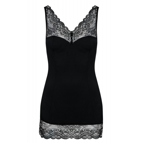 Детали: исключительно женственная сорочка с блестящими украшениями, ажурная отделка красиво подчеркивает вырез, регулируемые лямки - гарантия идеальной посадки, простой, свободный крой - полный комфорт при ношении, разрез на бедре и кружево по низу сорочки - сексуальные детали, блестящие камушки на вырезе и по низу платья - деталь, которая понравится каждой женщине, деликатные, приятные на ощупь ткани, простые черные трусики в комплекте.