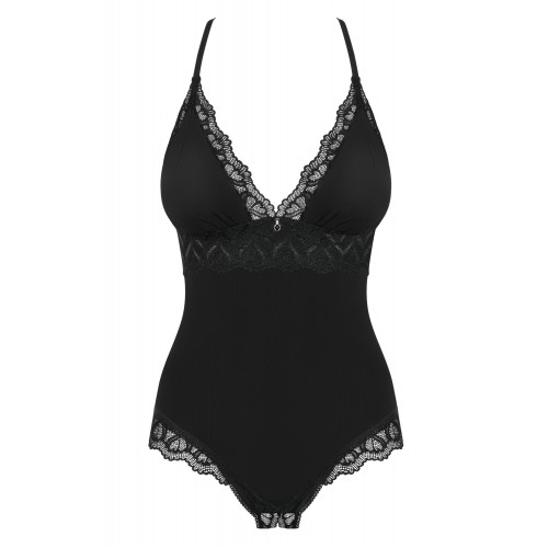 Детали: черное боди из мягкого материала, регулируемые бретельки на спине, кружевная окантовка в области груди - феноменально подчеркнутый бюст, красивое украшение на бюсте, кружевная вставка под грудью - супер женственный штрих, нижние края обработаны кружевом - аппетитно выделяют бедра, открытая промежность, очень приятная и идеально эластичная ткань Multistretch.