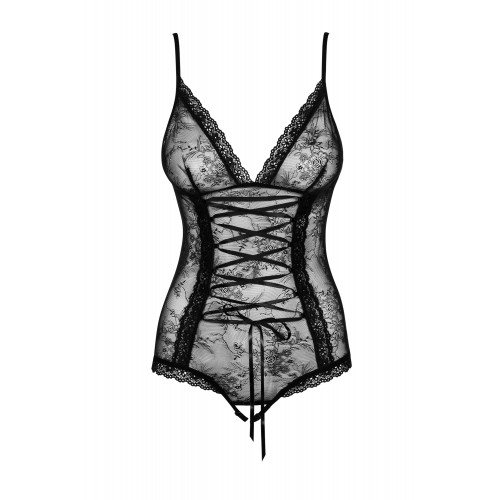 Детали: черное кружевное боди с глубоким вырезом, цветочный мотив, мягкие чашки подчеркивают бюст, регулируемые бретели обеспечивают идеальную посадку, вертикальная строчка подчеркивает талию, соблазнительная атласная шнуровка спереди, нежная кружевная отделка - идеальные детали, открытая промежность, эластичная, приятная на ощупь ткань.