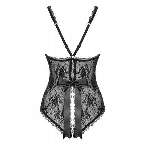 Детали: тонкое черное боди, эластичное кружево с цветочным узором, регулируемые бретельки с драгоценными камнями на спине буквой "V", крой, подчеркивающий талию, эластичная сетка - идеально подходит для любой фигуры, открытая промежность, сексуальный разрез на спине, доходящий до уровня талии, на спине большой кокетливый атласный бант, нежная и эластичная ткань Multistretch.