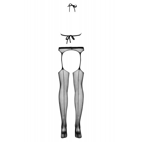 Боди-комбинезон выполнен из пикантной сеточки черного цвета. Сексуальные полосы в области животика подчеркивают фигуру.