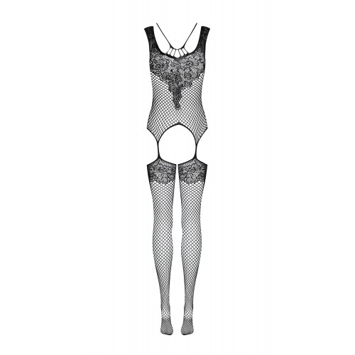 Детали: манящий боди-комбинезон с цветочным узором, широкие рукава и полоски украшают плечи и декольте, оптически стройнящий узор украшает бюст и спину, более крупные люверсы раскрывают талию и подчеркивают достоинства фигуры, открытая промежность и подчеркнутые ягодицы - лакомство для настоящей соблазнительницы, украшения на бедрах, имитирующие чулки и пояс для чулок, эластичный и идеально облегающий трикотаж - Multistretch.