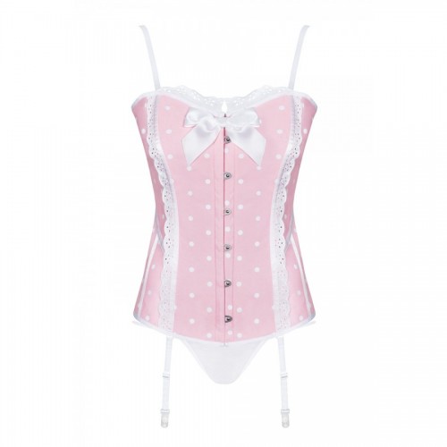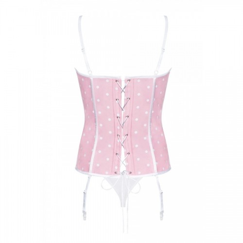 Гладкая ткань с крупными белыми горохами, тонкие полоски кружева, покрывающие вертикальные косточки-каркасы, и самое главное – пышный кокетливый бант прямо на груди – вот детали, которые не оставят незамеченной такую игривую красотку.