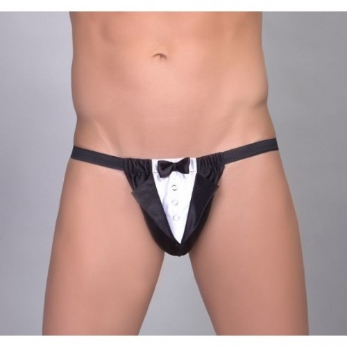 Стринги позволяют облачить мужской член в строгий смокинг, украшенныйчерной бабочкой и тремя белыми пуговицами.