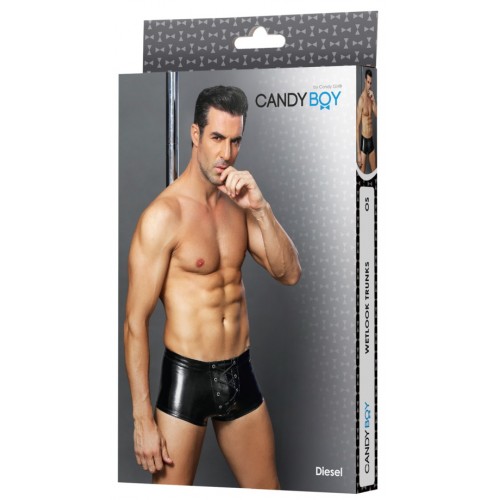 Выполненные из латекса боксеры сексуально облегают бедра, подчеркивая их! А акцентная шнуровка привлекает к себе внимание...