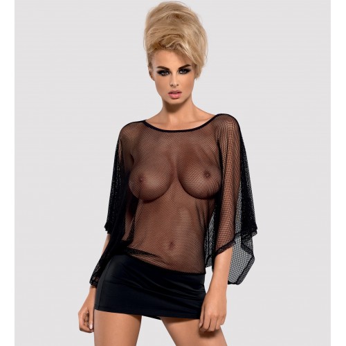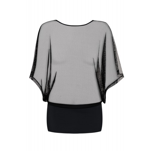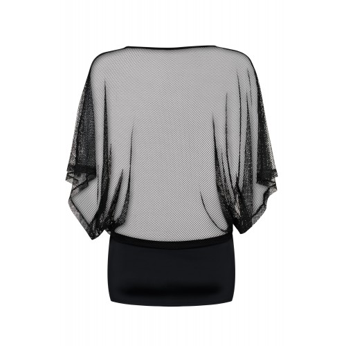 Платье представляет собой сочетание прозрачного сетчатого топа со свободными рукавами и мини-юбочки из плотной эластичной ткани.