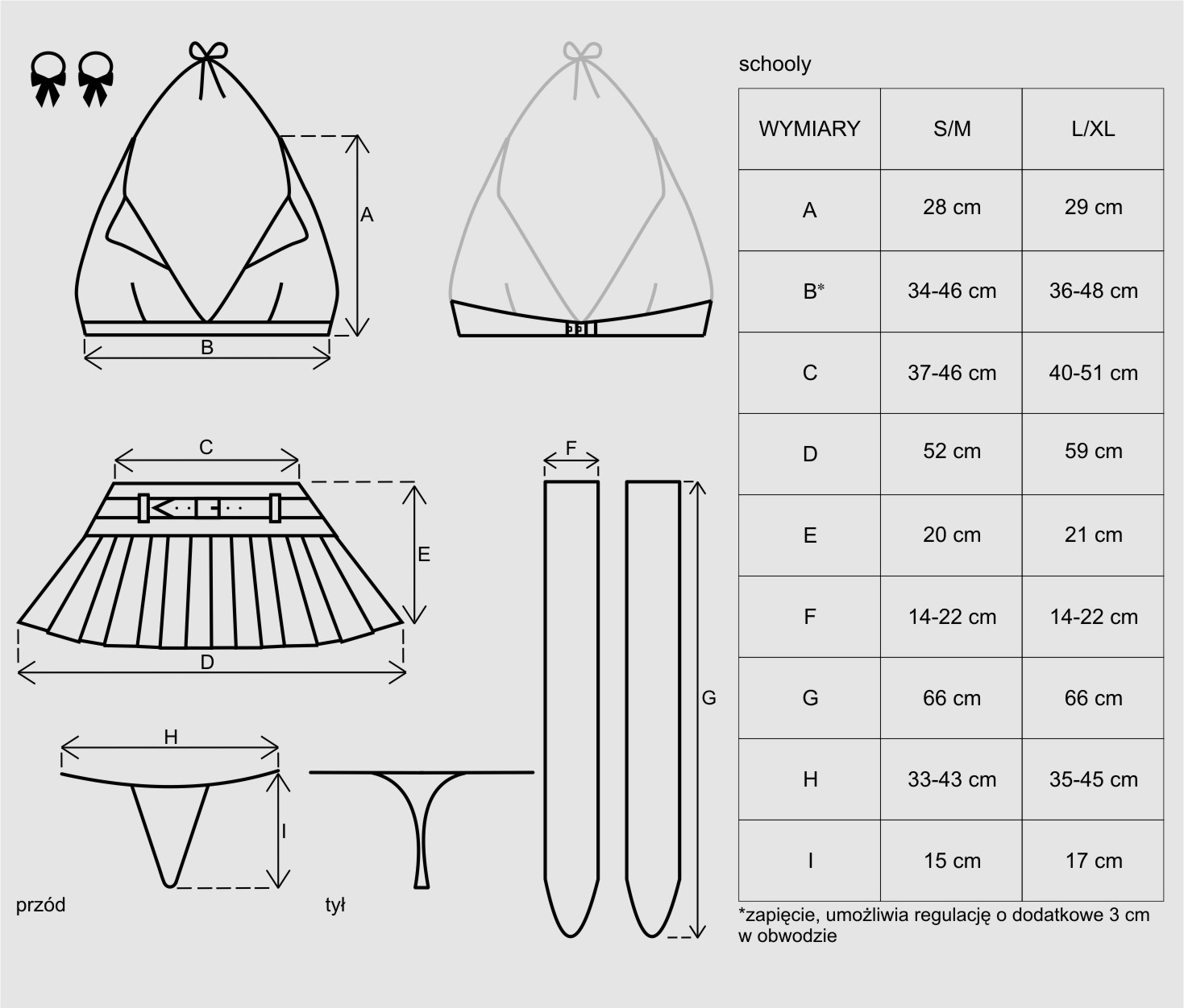 В комплект входят: лиф, юбочка, трусики, чулки, резиночки для волос с бантами.