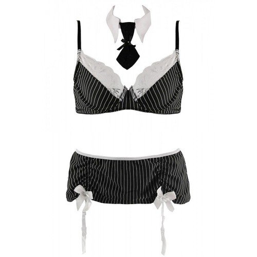 В комплект входят мини-топ с кружевом и регулируемыми бретелями, полосатая юбочка с подвязками для чулок и белоснежный воротничок-стойка с галстуком черного цвета. Приятная к телу ткань хорошо держит форму и не требует специального ухода.