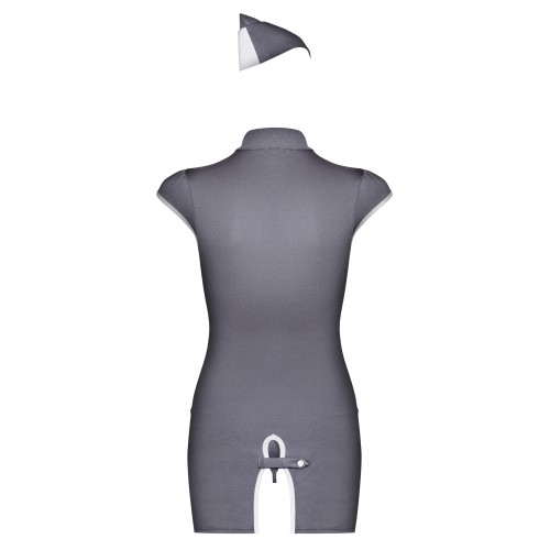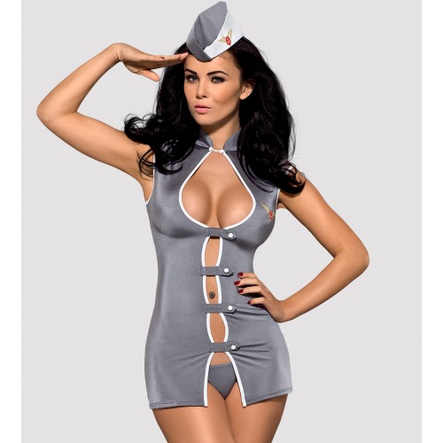 Детали: платье красиво облегает тело, сексуальные вырезы на животе и большое декольте подчеркивают бюст, сочетание воротника-стойки, жатки, коротких рукавов и имитационных петель создает особую атмосферу, вырез сзади кокетливо обнажает ягодицы, пилотка украшена значком в виде крылышка «Навязчивая услуга», эластичная ткань красиво облегает тело, подчеркивая его изгибы.