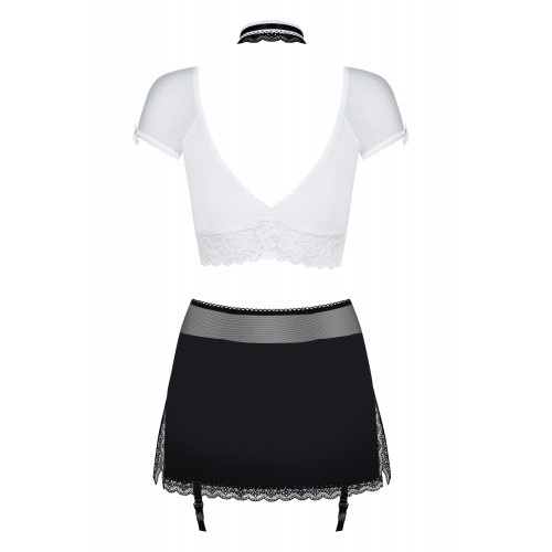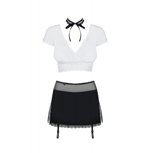 Детали: соблазнительный черно-белый воротник, завязанный на бантик, топ с сексуальным треугольным вырезом на спине, кружевной верх и сетчатые рукава, декоративные бантики на плечах, соблазнительная юбочка с разрезами по бокам, приоткрывающими ваши бедра, края юбки отделаны кружевом, трусики-стринги со съемными пажами для чулок, гладкая и приятная на ощупь ткань Multistretch.