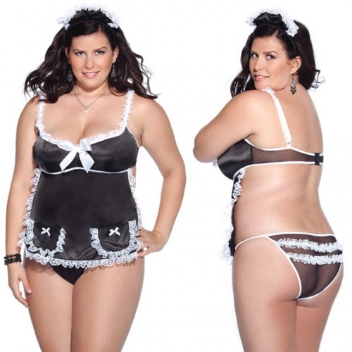 Откровенный комплект горничной из эластичной ткани с мерцающим блеском. Платье-фартучек черного цвета, спереди два кармашка. Лиф на косточках,сзади застежки крючки.Тонкие бретели регулируемой длины. Соблазнительное декольте украшает большой атласный бант. Края изделия окаймлены небольшими рюшами контрастного цвета. В комплекте ободок и трусики с заниженной талией расшиты игривыми рюшами на попке. Материал: 100% Acetate Цвет: Черный Размер: One Size XL Производитель: Coquette Internatonal Inc, 30 Wolseley Court Cambridge Ontario Canada 6X3, Канада