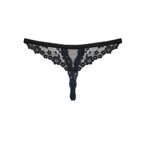 Игривые черные трусики-стринги выполнены из тонкого кружева с цветочным узором.