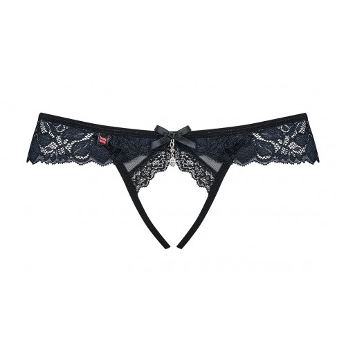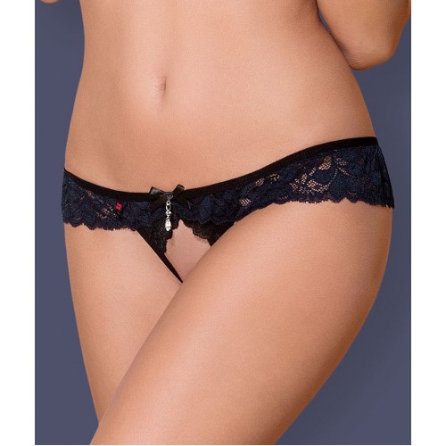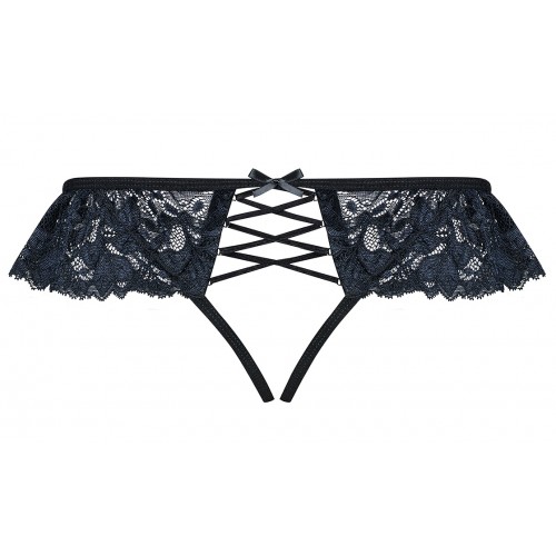 Детали: трусики чрезвычайно пикантного дизайна, пояс из темно-синего кружева с добавлением черного кружева - чувственное сочетание, открытая промежность - низ трусиков выполнен только из эластичных лямок - залог незабываемых ощущений, бант и подвеска спереди, бантик и скрещенные резинки на ягодицах - сексуальный вид, эластичные, идеально облегающие ткани.