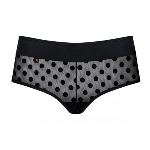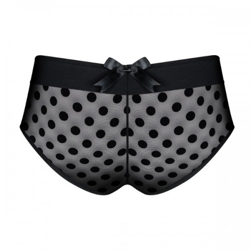 Трусики выполнены из нежной черной сеточки и украшены черным бархатистым рисунком в виде горошка.
