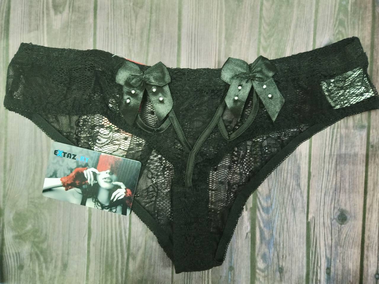 Выполнены из тоненького черного кружева. Являясь классическими трусиками, они красиво поднимают ягодицы и подчёркивают линию бёдер.