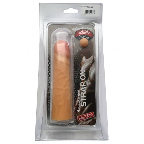 Насадка для страпона телесного цвета имеет форму члена и характерный рельеф, который создает дополнительную стимуляцию.
