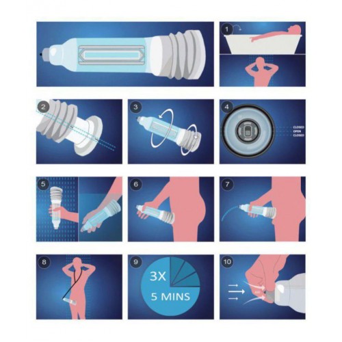 Ложимся в ванну, погружаем вакуумную помпу в воду, наполняем ее, затем засовываем пенис и надавливаем на помпу.